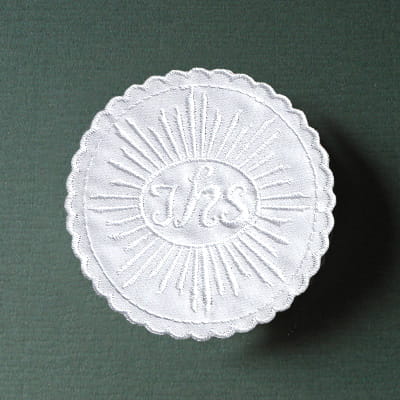 Emblemat IHS do naszycia na strój komunijny. Haft na atłasie, średnica 8 cm.