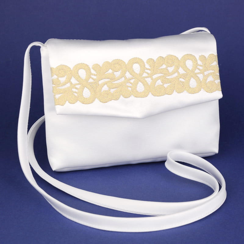 Satynowa torebka komunijna, uszyta z białej satyny. Na klapce połyskuje ozdobna złota taśma.