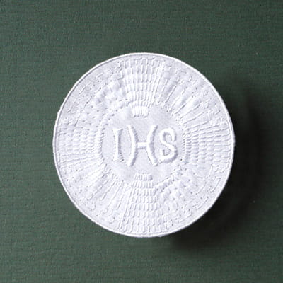 Biała, haftowana na atłasie hostia do naszycia na strój komunijny. Średnica 7 cm.