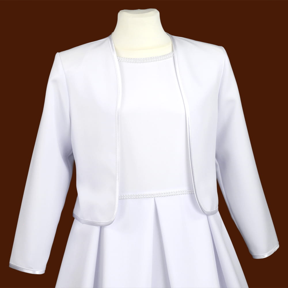 Biały matowy żakiet komunijny - długie bolerko wykończone lamówkami. Wykonany ze streczu, idealne do naszych sukienek ze streczu. Fason z długim rękawem, całość na podszewce.