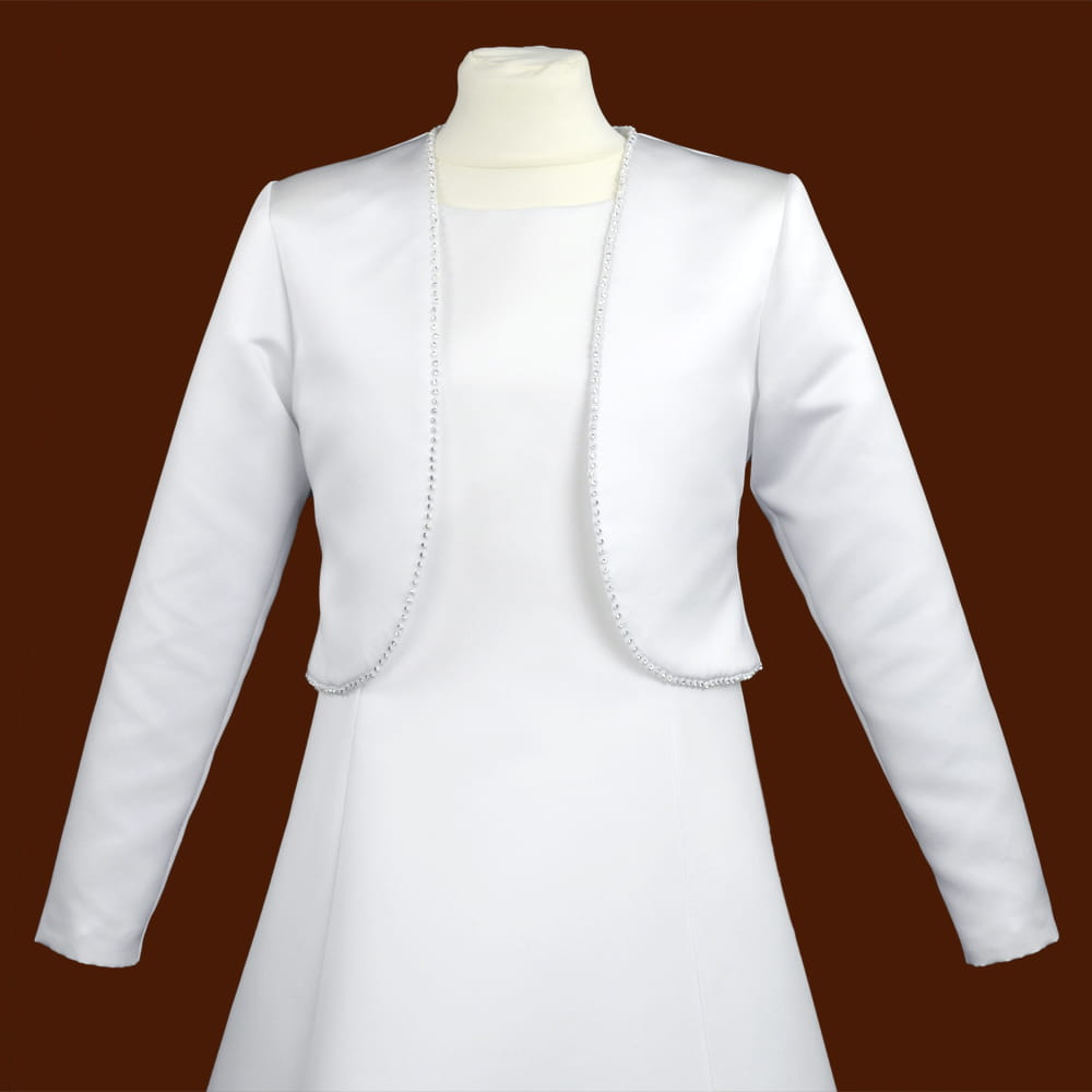 Eleganckie długie bolerko do sukienki komunijnej - żakiecik. Uszyte z wysokiej jakości białej satyny, na krawędzi ozdobione przepięknie mieniącymi się dżetami. Fason z długim rękawem, całość na podszewce.