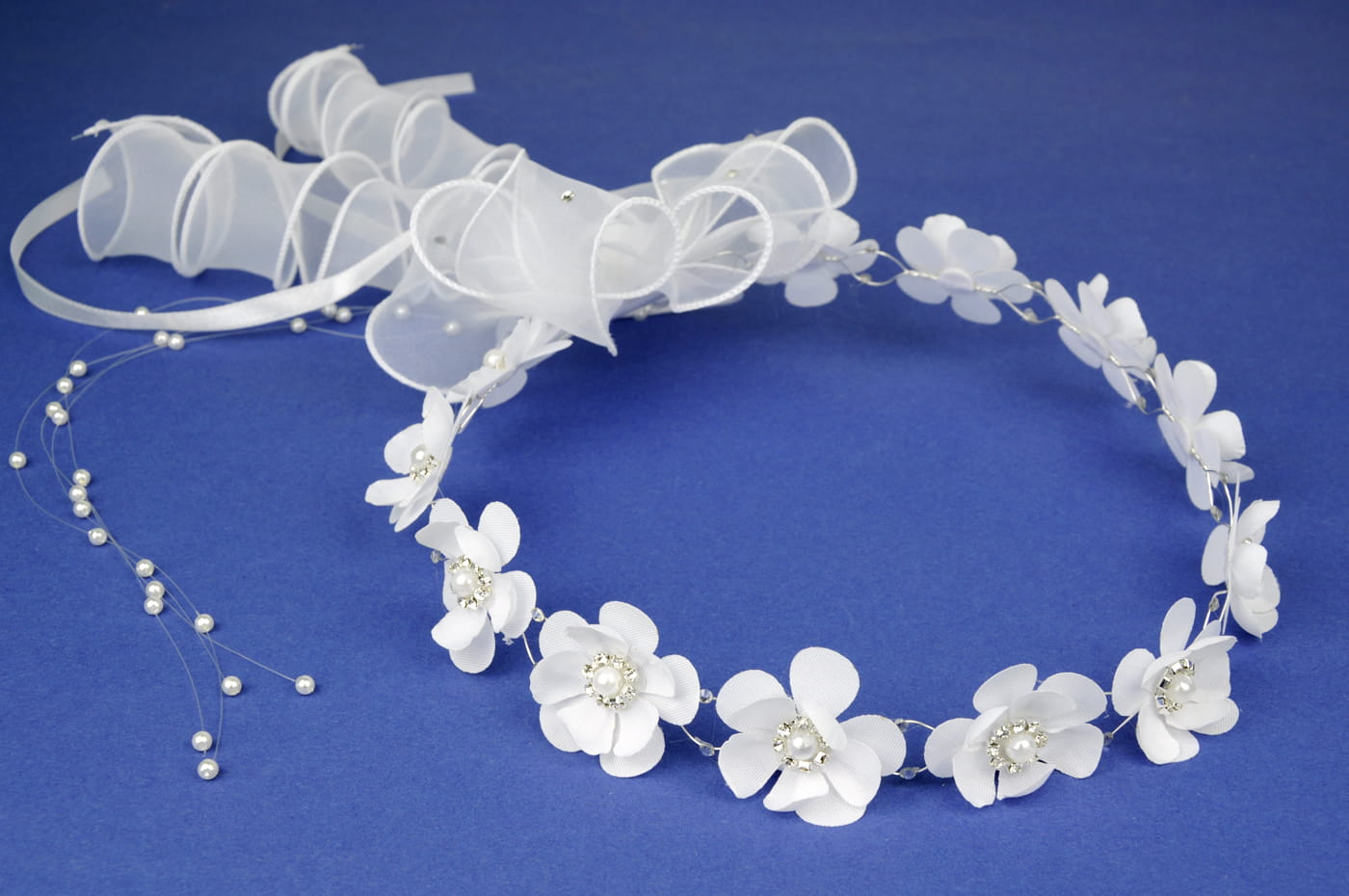 Wytworny wianek komunijny skomponowany z materiałowych kwiatków obsadzonych na splecionym druciku. Środek każdego kwiatka przepięknie zdobiony perełką otoczoną błyszczącymi dżetami. Tył zdobi organdynowa kokarda z lokami, przystrojona kwiatkiem i dżetami. Dodatkowo luźno zwisające tasiemki i perełki na żyłce. Wianek polecany zarówno do alb jak i sukienek komunijnych. Obwód wewnątrz wianka ok. 52 cm.