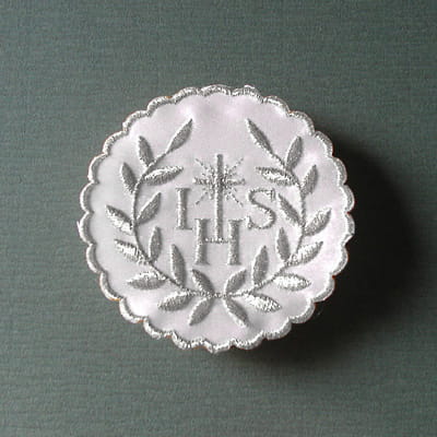 Hostia z listkami haftowana srebrną nitką na białym, MATOWYM STRECZU.