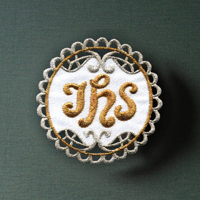 Haftowana ażurowa hostia IHS w kolorze srebrno-złotym. Na odwrocie posiada termofolię, wystarczy naprasować żelazkiem. Średnica 8 cm