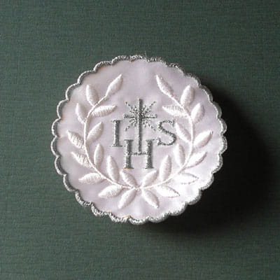 Hostia z listkami haftowana srebrną nitką na białym atłasie lub matowym streczu. Emblemat IHS do przyszycia do alby lub sukienki komunijnej. Średnica 8 cm.