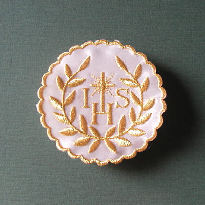 Hostia z listkami haftowana złotą nitką na białym matowym streczu. Emblemat IHS do naszycia na strój komunijny. Średnica 8 cm.