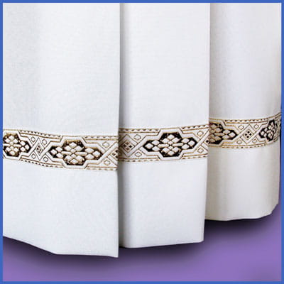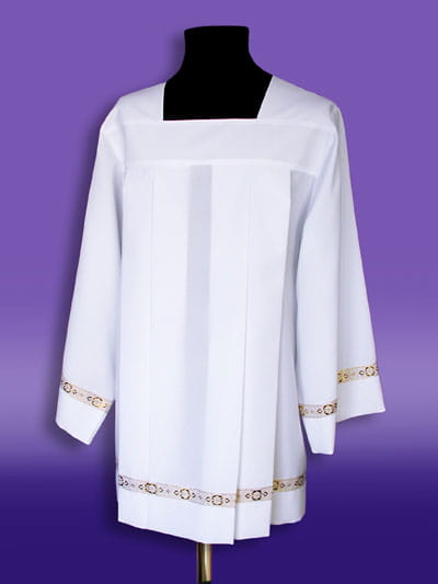 Komża dla ministranta zdobiona złotą żakardową taśmą.