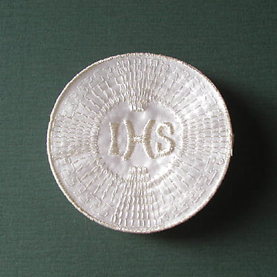 Hostia haftowana srebrną nitką na białym atłasie lub matowym streczu.