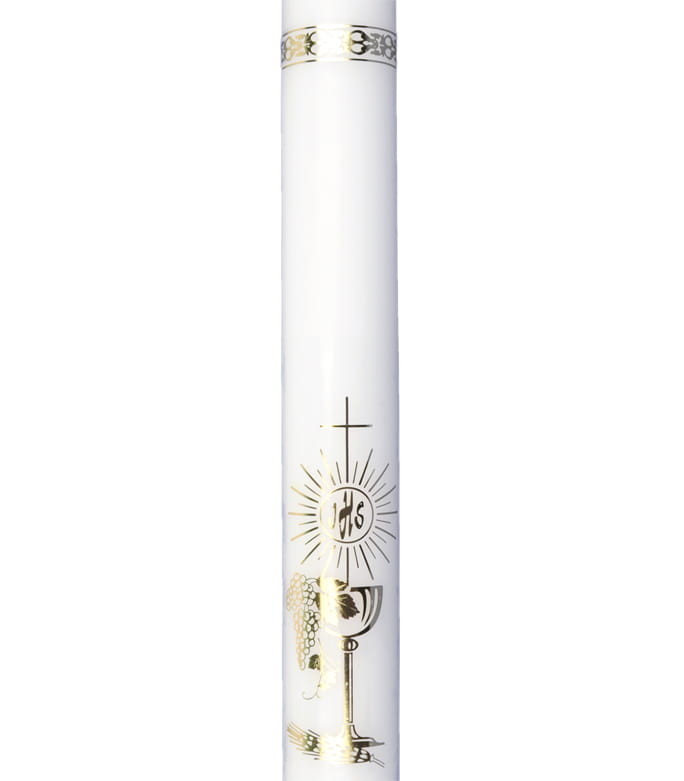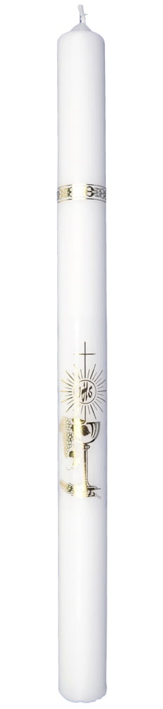 Biała świeca komunijna ze złotą naklejaną aplikacją kielicha z hostią.