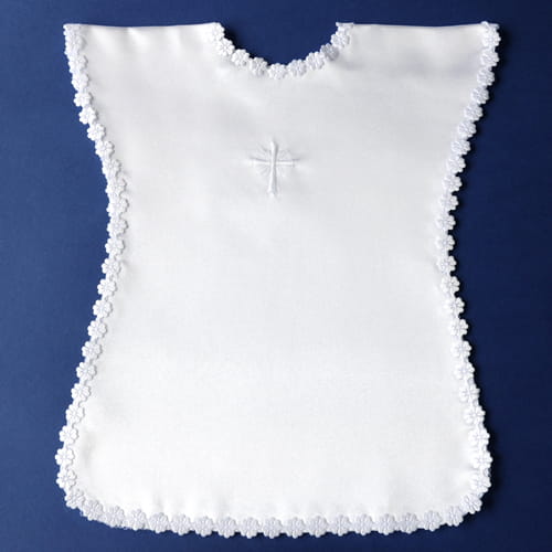 Koszulka chrzcielna z atłasu, zdobiona subtelnym haftem. Brzegi wykończone atłasową taśmą z kwiatkami.