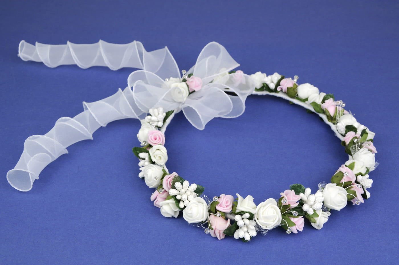 Wianuszek skomponowany głównie z białych i różowych róż, w które wpleciono koraliki na druciku. Tył wianka ozdobiony jest szyfonową kokardą z lokami. Ta ozdoba na głowę doskonale sprawdzi się do sukienek komunijnych jak i do alby.