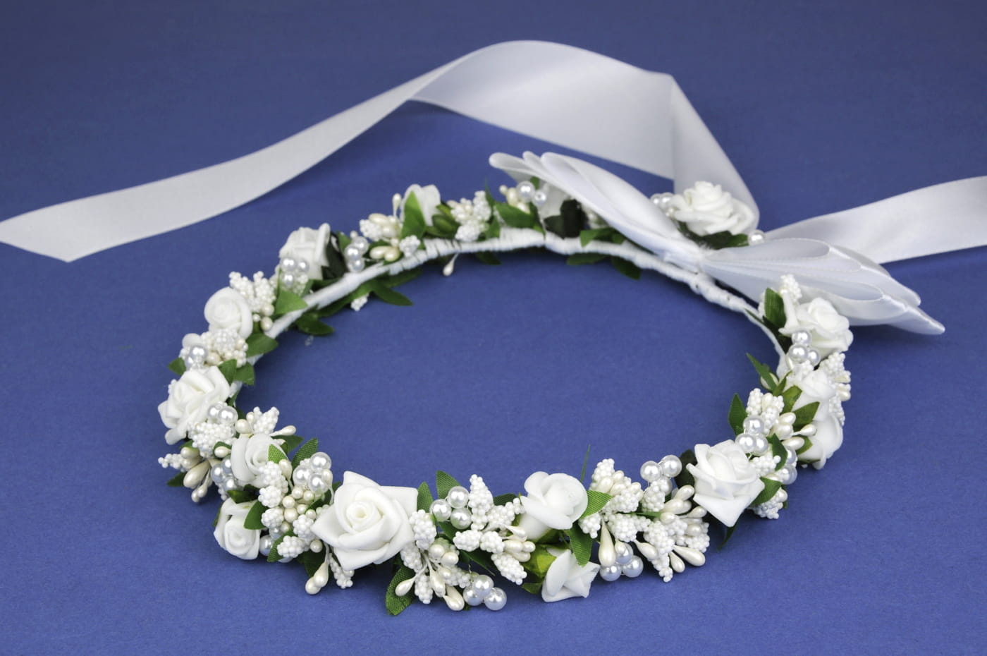Prześliczny wianek do komunii, spleciony z białych róż o różnej wielkości i szyszeczek, między którymi mienią się elegancko duże perły na drucikach. Tył wianka ozdobiony jest wstążką z kokardą.